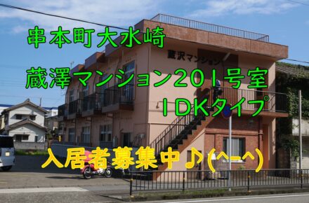 串本町大水崎にある賃貸物件、蔵澤マンションの1階部分の3DKタイプの募集案内です。場所は串本町大水崎、国道42号線沿いに位置していて、近くには家電のエディオン、ドラッグストアのセイムスがあり、サンゴ台へのアクセスも良く串本町役場・くしもと病院へも近距離です。少し足を延ばせばスーパーのオークワ等にも近く比較的便利な場所に立地しています。サンゴ台へのアクセスも良く串本町役場・くしもと病院も近隣です。地元の方はもちろんの事、現在建設が進められている高速道路の工事関係者にもお勧めできる場所です。3DKになっていますので3名でシェアして頂くのもありかなと思います。また、橋杭海水浴場も近く散歩コース等の自然環境にも恵まれた位置です。