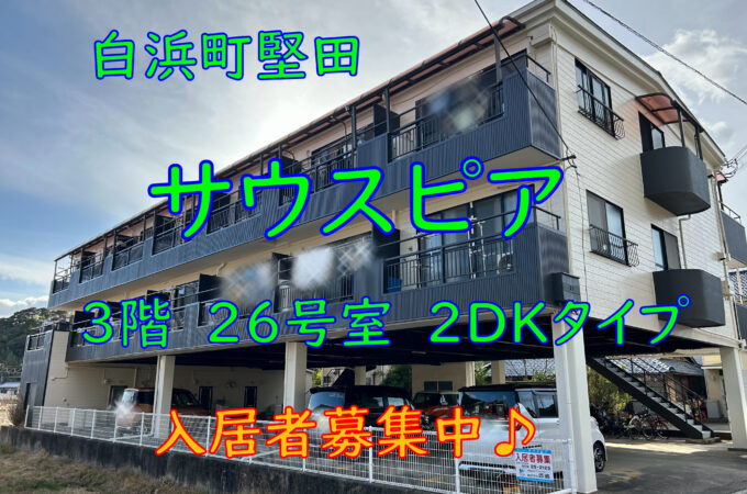こんにちは、管理人の東出です。 白浜町堅田にある鉄骨造3階建ての賃貸マンション サウスピアの2DKタイプの募集案内になります。マン...